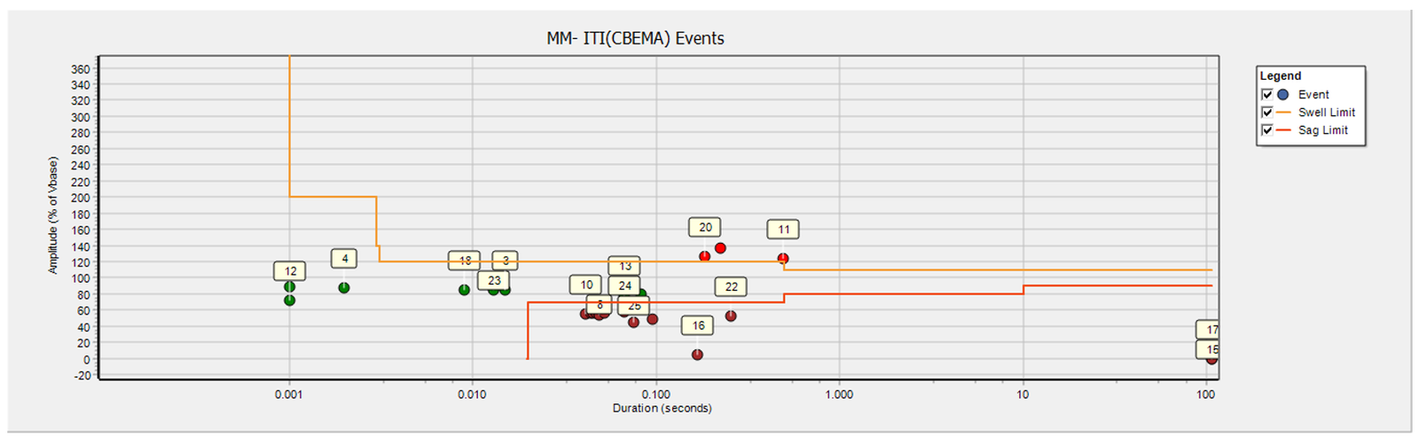 El voltaje RMS promedio permaneció dentro de ±5% en todo el periodo, con comportamiento estable. Sin embargo, se detectaron caídas de tensión (sags) e interrupciones, visibles en la curva ITIC.