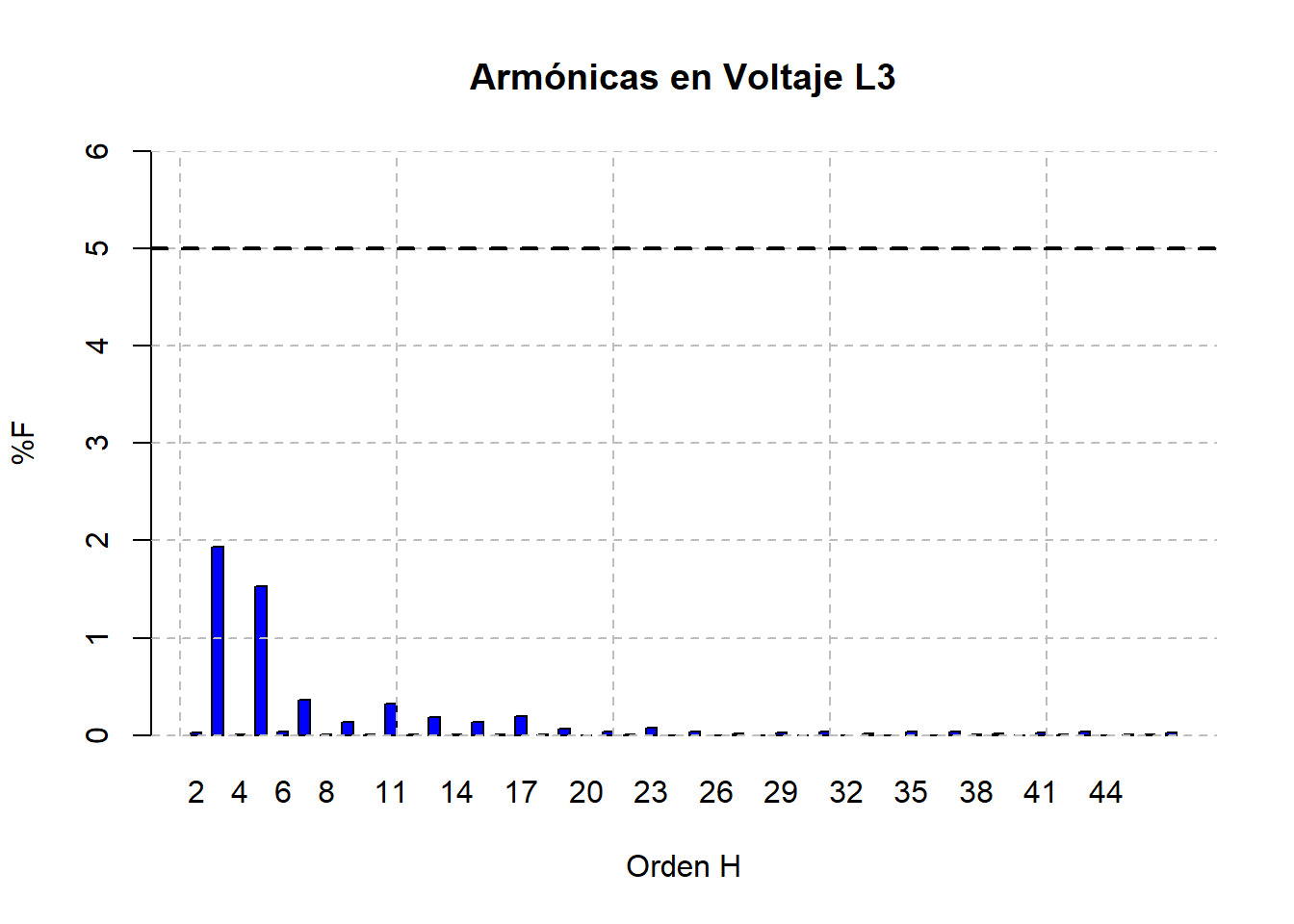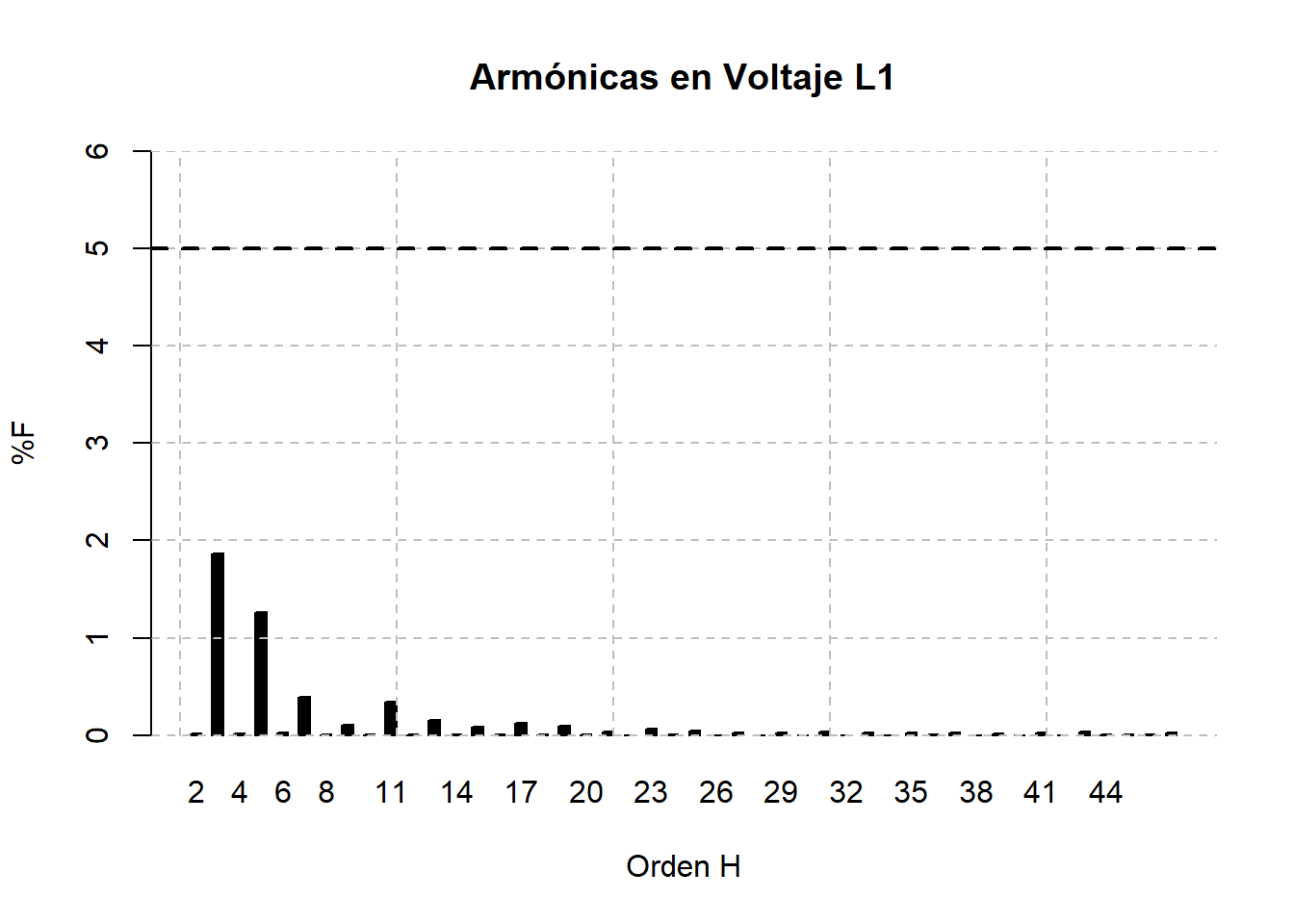 Tensión: armónicas dominantes 3ª, 5ª, 7ª, 11ª y 13ª. El THD fue de 1.97% (percentil 95) y 1.57% promedio, niveles típicos en edificios con alta carga de equipos de oficina.